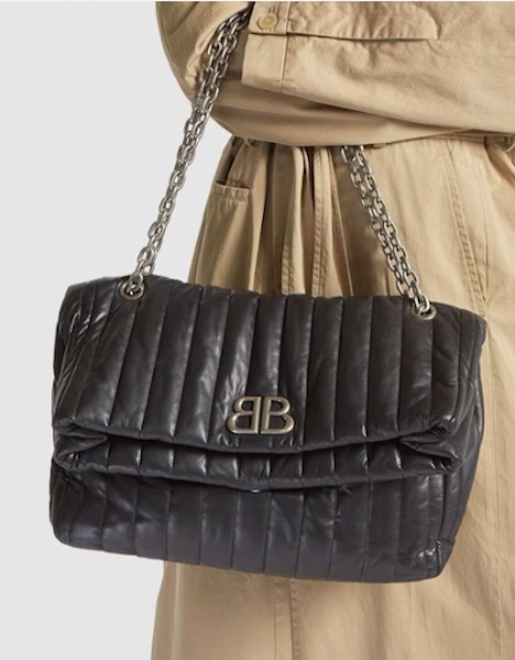 バレンシアガ Monaco レザーショルダーバッグは、フラップ&マグネットスナップボタン開閉のサイズ:高さ: 22cm 幅: 32.5cm 奥行き: 10cm、BBロゴ、メタルチェーンストラップ仕上げの大きめバッグ、カーフレザーキルティング仕上げの大胆なバッグです。