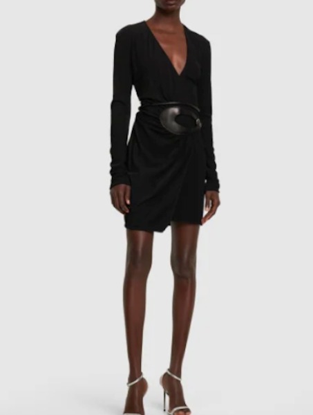 トムフォードジャージーミニドレスは、レザーベルトが付属したブラックのラップドレス、大胆に開いたVネックラインとミニ丈がセクシーな魅力を追加します。