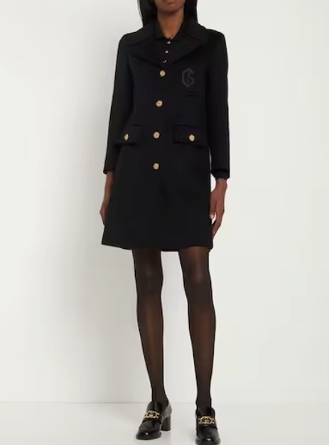 ウールコートは、フラップポケット2か所、胸ポケット1か所、ゴールドトーンのロゴボタン、ダブルGエンブロイダリーで仕上げられたブラックウール製、シックで美しいアウター、デイリー使いにパーフェクトです。