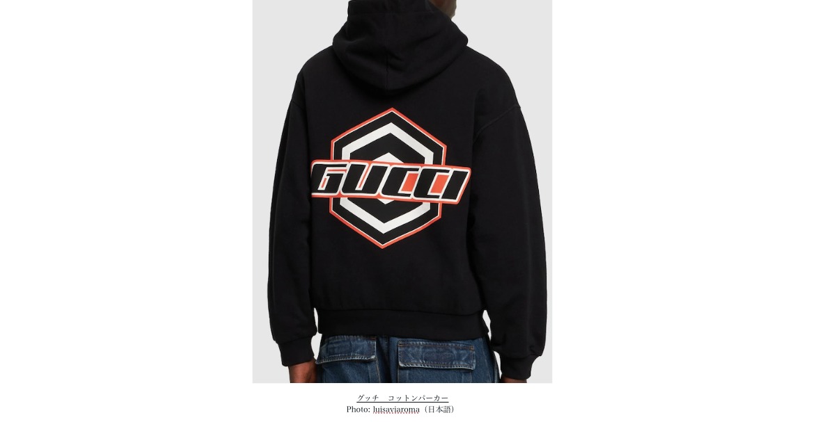 グッチ コットンパーカーは、新しいレーサー風のロゴがひかるブラックコットン製のスウェット、リブの袖口、裾、ドロップショルダーで仕上げられました。休日のコーデにぴったり、洗練されたムードです。